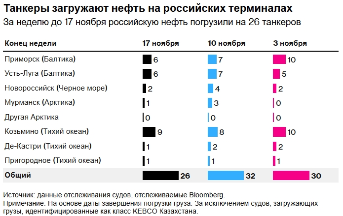 По данным отслеживания судов и отчётам портовых агентов, за неделю до 17 ноября в общей сложности 26 танкеров погрузили 19,8 млн баррелей российской сырой нефти. Это значительное снижение по сравнению с пересмотренными 24,98 млн баррелей на 32 судах на предыдущей неделе.
