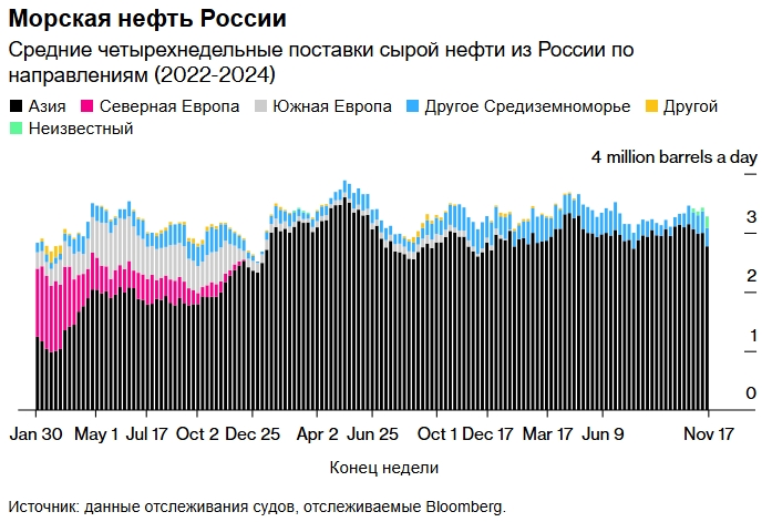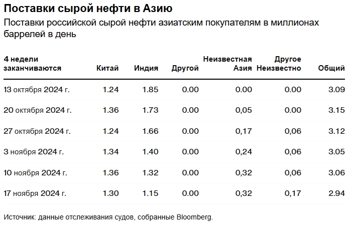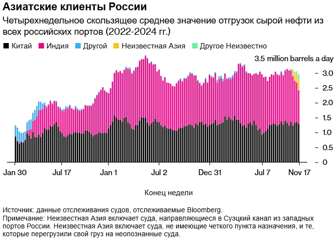 В период с 10 по 17 ноября 2023 года объём поставок российской нефти в Азию, включая те, у которых нет конечного пункта назначения, составил 2,94 млн баррелей в день.