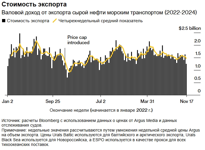 Доходы Кремля от экспорта нефти резко упали из-за снижения средних недельных цен на основные потоки сырой нефти в России, что усугубило эффект от снижения объёма экспорта. Вместе они снизили валовую стоимость экспорта Москвы примерно на 380 млн долларов до 1,25 млрд долларов за неделю до 17 ноября. Это самый низкий показатель с января.