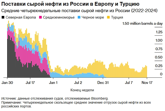 Турция теперь является единственным рынком коротких перевозок для поставок из западных портов России. Поставки за 28 дней до 17 ноября упали примерно до 340 000 баррелей в день с четырёхмесячного максимума в период до 10 ноября.