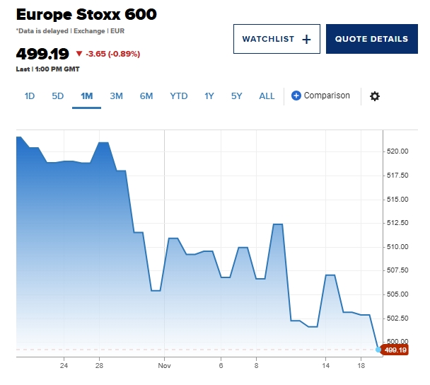 Панъевропейский фондовый индекс Stoxx 600 снизился почти на 1% по состоянию на 12:23 по лондонскому времени, достигнув отметки 498,56 - самого низкого уровня с августа. В США фондовые фьючерсы, привязанные к промышленному индексу Доу-Джонса, упали на 0,5 %, фьючерсы на индекс S&P - на 0,2 %, а фьючерсы на индекс Nasdaq 100 - на 0,1 %.