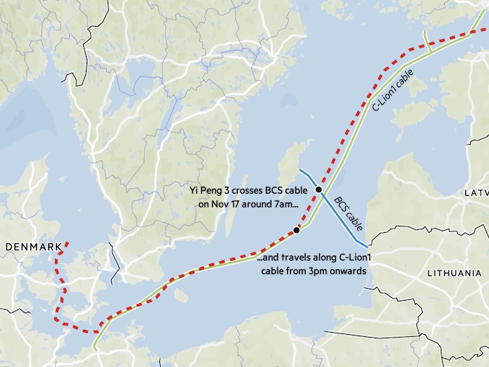 Судно Yi Peng 3, зарегистрированное в Китае и следовавшее из российского порта Усть-Луга в Порт-Саид в Египте, прошло близко к шведско-литовским и финско-германским кабелям примерно в то время, когда они были повреждены. Об этом сообщает компания MarineTraffic, отслеживающая морской трафик. Эксперты по открытым источникам сообщили, что за грузовым судном впоследствии внимательно следил датский флот.Швеция начала расследование по обоим инцидентам и изучает, какую роль могло сыграть судно Yi Peng 3, сообщили люди, знакомые с расследованием.