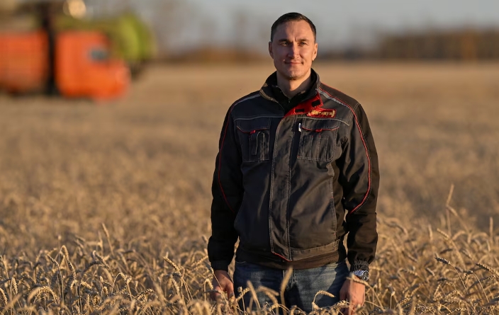 Максим Левшунов, заместитель руководителя сельскохозяйственного предприятия «Тритикум», позирует для фотографии на поле во время уборки пшеницы в Черлакском районе Омской области, Россия, 4 октября 2024 года. REUTERS/Алексей Мальгавко/Архивное фото