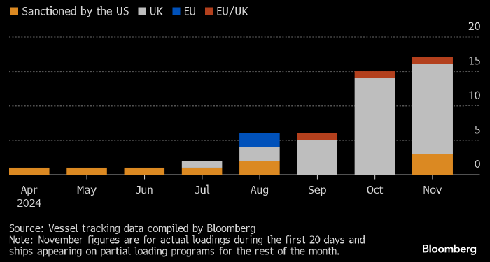Число судов под санкциями США (оранжевым), Великобритании (серым), ЕС (голубым) и Великобритании/ЕС (бордовым), участвующих в перевозке российской нефти. Данные и источник: Bloomberg
