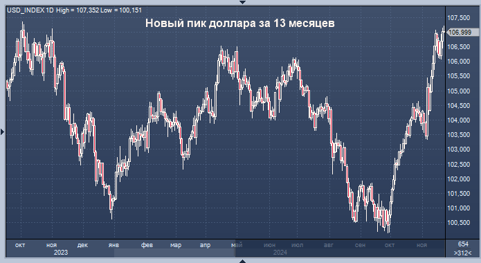 Индекс доллара вырос на 0,08% и составил 107,15, достигнув самого высокого значения с 4 октября 2023 года (107,18). На этой неделе было опубликовано мало данных, которые могли бы повлиять на его силу.