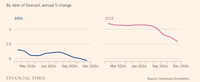 Экономические прогнозы в Германии ухудшились больше, чем в других развитых странах. Это связано с тем, что она будет крайне уязвима, если администрация Трампа исполнит задуманное и введет торговые барьеры. Экономисты, опрошенные Consensus Economics, ожидают, что экономика Германии вырастет всего на 0,6% в 2025 году, что ниже роста 1,2%, прогнозируемого в середине года. Это крупнейшее снижение прогноза роста за этот период среди всех крупных промышленных экономик.