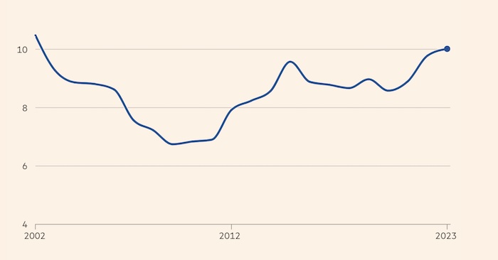 США в 2023 году потребляли 10% немецкого экспорта — самый высокий уровень более чем за два десятилетия. С 2015 года США заменили Францию в качестве важнейшего торгового партнера Германии и их значимость продолжала расти, поскольку Китай — быстрорастущий рынок в два десятилетия до пандемии — массово снизил свой интерес к немецкой продукции, а санкции ударили по продажам в Россию.