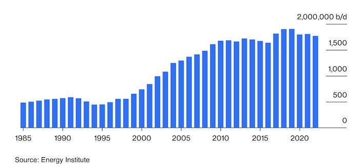 Объем добычи нефти в Казахстане устойчиво растет. Источник: Bloomberg