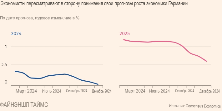 Согласно прогнозам Consensus Economics, в 2025 году экономика Германии вырастет всего на 0,6%, что ниже прогнозируемого в середине года роста на 1,2%. Это самое значительное снижение прогноза роста за этот период среди всех крупных промышленных экономик.
