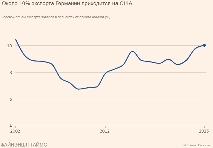 В 2023 году на США пришлось 10% немецкого экспорта, что является самым высоким показателем за последние два десятилетия.