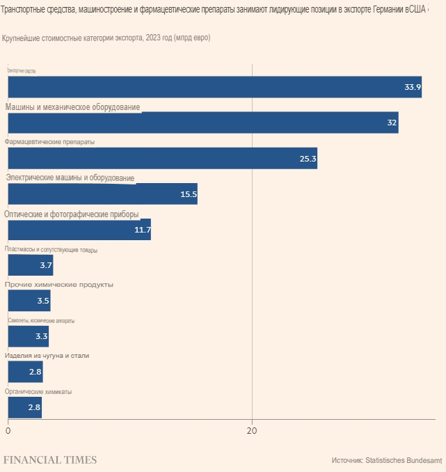 Немецкие автопроизводители, которые борются с дорогостоящим переходом на электромобили, жёсткой конкуренцией со стороны китайских конкурентов и раздутыми издержками, а также фармацевтические группы пострадают особенно сильно. США получают 13% всех зарубежных продаж автомобилей Германии и 22% её фармацевтического экспорта. Оценки аналитического центра Ifo предполагают, что обе страны рухнут на треть в полномасштабной торговой войне.