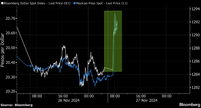 Доллар вырос, а акции упали после того, как избранный президент Дональд Трамп заявил, что США введут дополнительные пошлины на продукцию из Китая, Мексики и Канады, что усилило обеспокоенность по поводу его политики «Америка прежде всего».