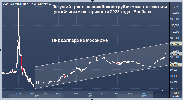 Текущий тренд на ослабление рубля может оказаться устойчивым на горизонте 2025 года, полагают аналитики Росбанка.