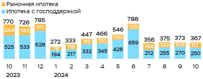 Подобные меры, вероятно, могут привести к охлаждению корпоративного кредитования, чего, помимо прочего, и добивается регулятор. Еще более позитивными выглядят замедление темпов роста выдачи ипотечных кредитов (до 0,7% м/м с 0,9% м/м в августе и сентябре)
