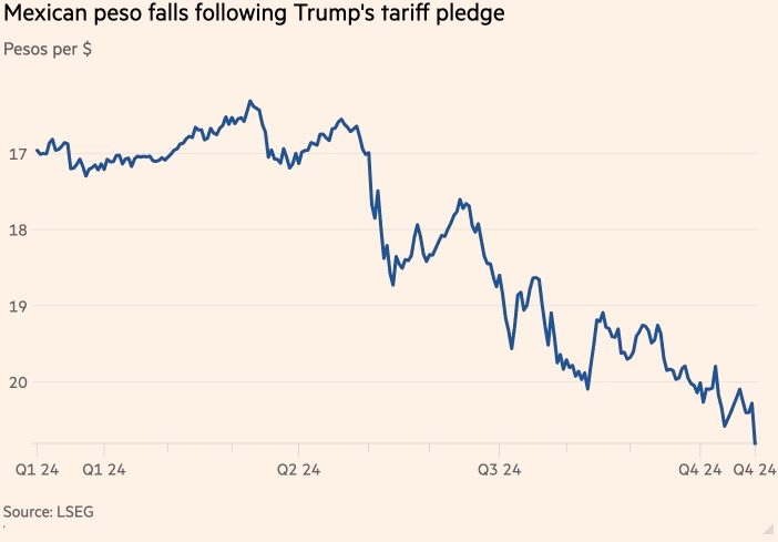 Мексиканский песо упал на 2,5% по отношению к доллару США, а канадский — на 0,7%, достигнув ранее во вторник четырёхлетнего минимума.