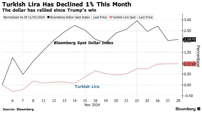 По оценкам Bloomberg Intelligence, несмотря на номинальное снижение на 15% по отношению к доллару США в 2024 году, лира выросла в реальном выражении, привлекая миллиарды долларов США в виде потоков операций керри-трейд.