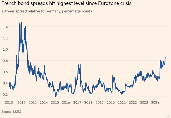 На фоне политической нестабильности распродажа государственных облигаций Франции привела к росту доходности 10-летних облигаций до более чем 3%, поскольку инвесторы обеспокоены устойчивостью долговой нагрузки Парижа. Доходность сейчас лишь немного ниже, чем в Греции, которая оказалась в центре кризиса суверенного долга более десяти лет назад.