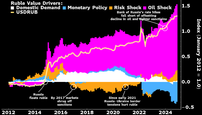 Драйверы рубля (оценка Bloomberg Economics): белым — спрос на национальную валюту внутри страны, голубым — ДКП, желтым — толерантность к риску у российских инвесторов, фиолетовым — шок со стороны нефтяных цен, желтым — курс USDRUB. Источник: Bloomberg