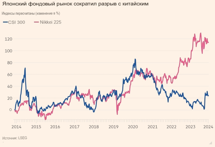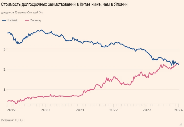 Впервые за долгое время доходность облигаций Китая стала ниже, чем в Японии. Инвесторы делают ставку на то, что вторая по величине экономика мира столкнётся с дефляцией, которая уже давно преследует её соседа.