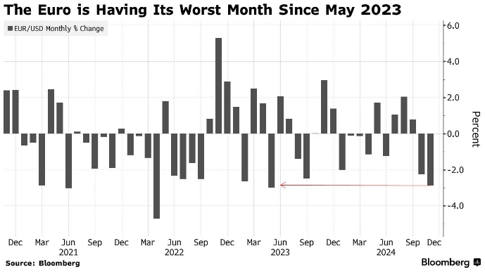 В ноябре единая валюта потеряла около 3% стоимости, достигнув отметки в 1,0575 доллара, что близко к двухлетнему минимуму, зафиксированному в начале месяца. Это стало самым значительным падением за месяц с мая 2023 года.