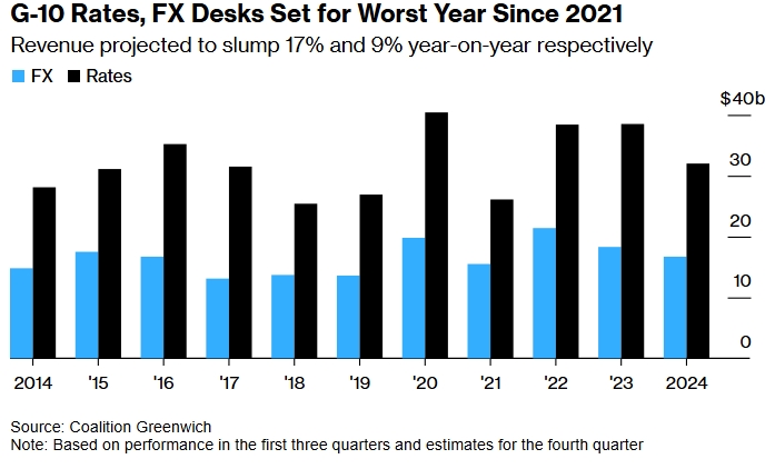 По данным Coalition Greenwich, более 250 компаний, включая Goldman Sachs Group Inc., JPMorgan Chase & Co., Citigroup Inc. и Morgan Stanley, прогнозируют общий доход от операций с процентными ставками G10 в размере $32 млрд и от операций с валютами — $16,7 млрд. Это на 17% и 9% меньше, чем в прошлом году соответственно.