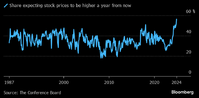 По результатам последнего опроса американцев, проведенного Conference Board, выяснилось, что 56,4% респондентов ждут роста рынка акций США в ближайший год. Это на 4,5 п.п. больше, чем месяцем ранее и самое высокое значение за всю историю ведения подобной статистики с 1987 года.