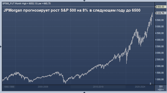 Банк ожидает, что индекс S&P 500 завершит год на уровне 6500 пунктов, что на 8% выше текущего уровня. Ранее JPMorgan прогнозировал, что к концу 2024 года индекс достигнет отметки 4200 пунктов.
