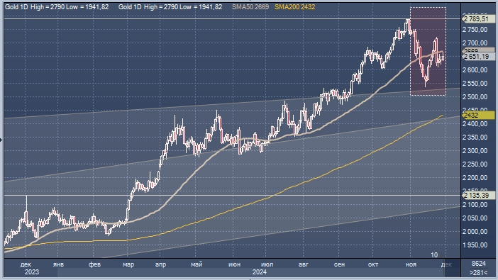 С начала месяца золото упало на 3%, что стало самым серьезным месячным падением с сентября 2023 года, поскольку " эйфория Трампа " привела к росту доллара в начале этого месяца и остановила рост золота, спровоцировав распродажу после выборов.