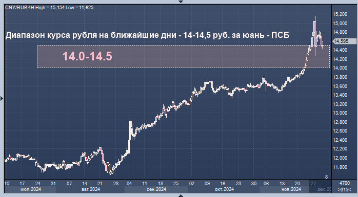 Целевой диапазон курса валютной пары юань/рубль на ближайшие дни составляет 14-14,5 руб. за юань, считает начальник отдела экономического и отраслевого анализа Промсвязьбанка (ПСБ) Евгений Локтюхов.