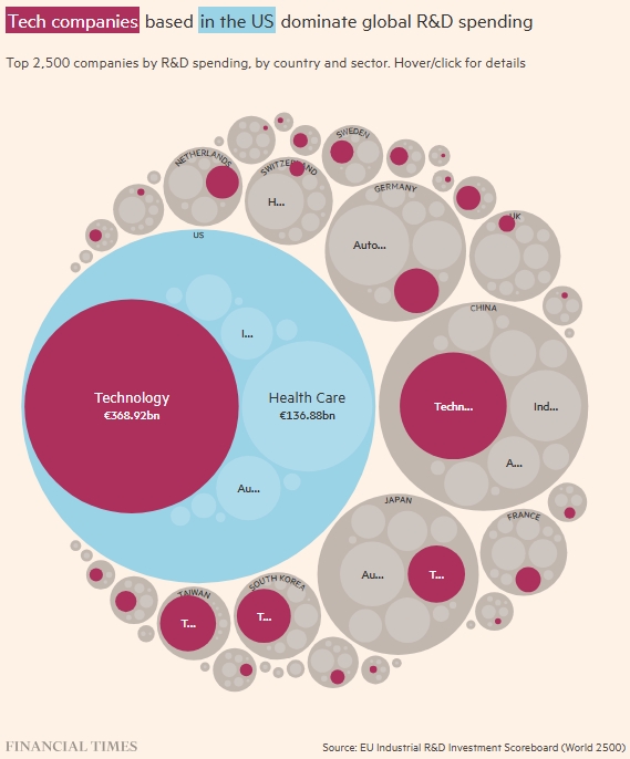 Технологические компании, базирующиеся в США, доминируют в мировых расходах на НИОКР. 2500 лучших компаний по расходам на НИОКР, по странам и секторам. FT. Источник: Таблица инвестиций в промышленные НИОКР ЕС (World 2500)