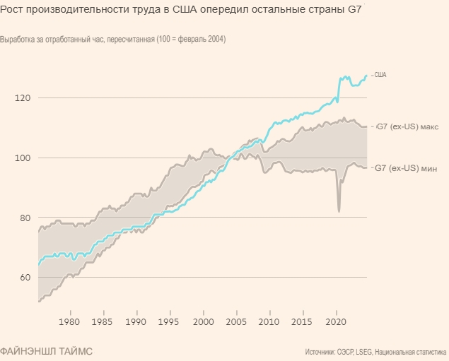 США достигли значительных успехов в этой области. Согласно официальным данным, за три месяца до сентября 2024 года производительность труда в США за час работы выросла на 8,9% по сравнению с допандемическим уровнем в конце 2019 года. Это увеличение составило 2–2,8% за год.