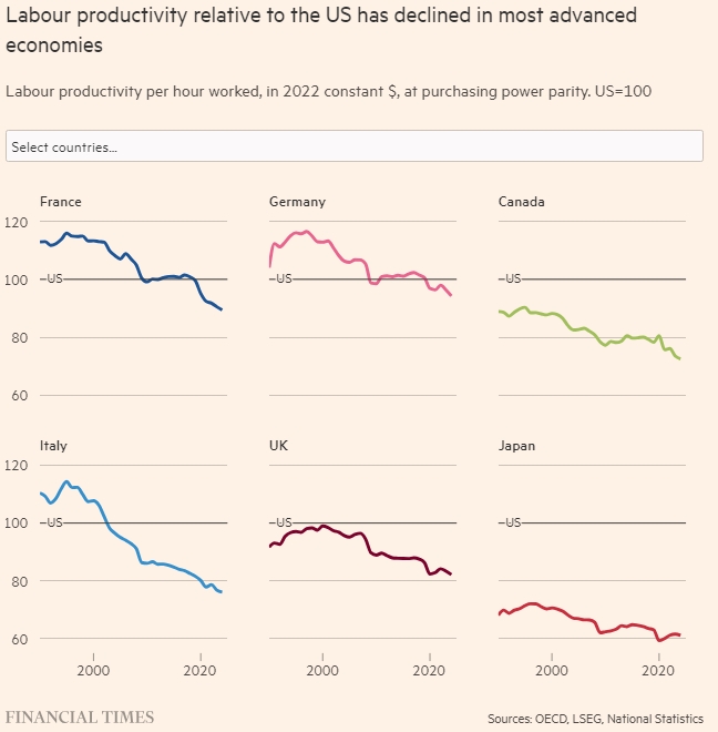 В Великобритании новое лейбористское правительство пообещало «десятилетие обновления», чтобы решить проблему, которую экономисты назвали «головоломкой производительности». Решение проблемы низкого роста производительности является ключевой рекомендацией МВФ для Японии, в то время как в эпохальном докладе, опубликованном в сентябре Марио Драги, бывшим президентом Европейского центрального банка, слабая конкурентоспособность описывается как «экзистенциальный вызов» для ЕС.