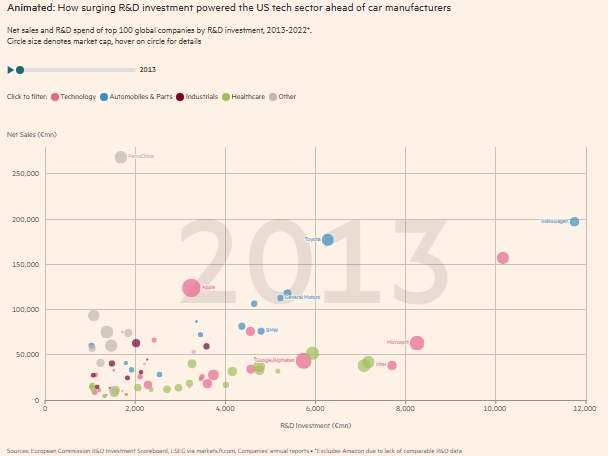 Анимация: как растущие инвестиции в НИОКР помогли технологическому сектору США обогнать автопроизводителей. Чистые продажи и расходы на НИОКР 100 крупнейших мировых компаний по объему инвестиций в НИОКР, 2013–2022 гг. и более.Размер круга обозначает рыночную капитализацию. 2013 год