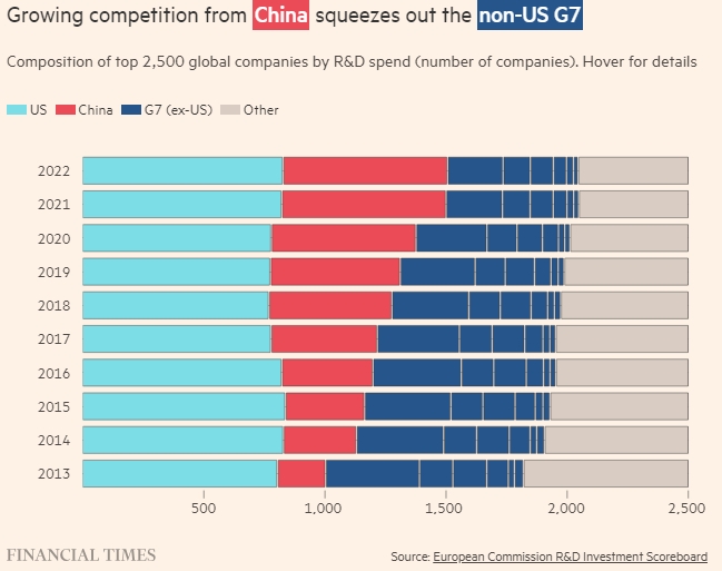 Растущая конкуренция со стороны Китая вытесняет страны G7, кроме США. Состав 2500 крупнейших мировых компаний по расходам на НИОКР (количество компаний). FT. Источник: Таблица инвестиций в НИОКР Европейской комиссии.
