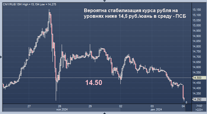 Вероятна стабилизация курса рубля на уровнях ниже 14,5 руб./юань в среду, полагает начальник отдела экономического и отраслевого анализа Промсвязьбанка (ПСБ) Евгений Локтюхов.