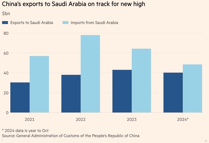 Экспорт из Китая в Саудовскую Аравию и инвестиции из этой страны в королевство растут, поскольку спрос на экологически чистые технологии в королевстве углубляет отношения, которые ранее определялись исключительно продажей нефти. Это ставит под сомнение деловые связи с традиционными западными партнёрами.