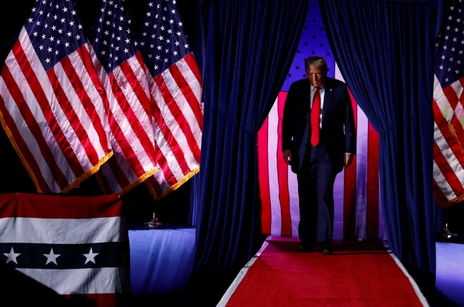 Избранный президент Дональд Трамп выходит на сцену для своего последнего митинга в предвыборный год 5 ноября 2024 года в Гранд-Рапидс, штат Мичиган. Чип Сомодевилла/Getty Images
