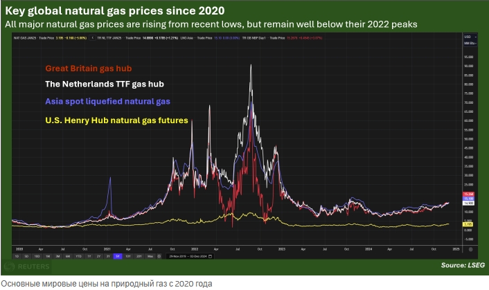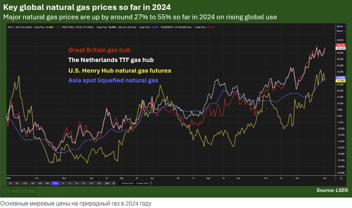 В 2024 году цены на природный газ в Азии, Европе и Северной Америке выросли примерно на 30–50%. И, судя по всему, в ближайшие месяцы они продолжат расти. Это связано с прогнозами о холодной погоде, которая повышает спрос на отопление в ключевых регионах.