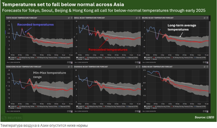 По данным LSEG, в Сеуле (Южная Корея) средняя температура в декабре составит около -2,17 °C (-28 °F) по сравнению с долгосрочным средним значением -0,7 °C. Это на 1,4 °C ниже нормы.