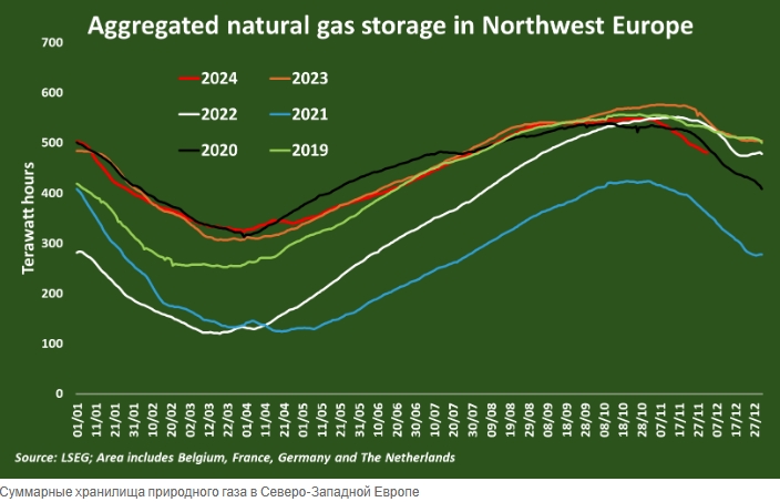 По данным LSEG, с 1 октября по конец ноября совокупные запасы газа в Германии, Нидерландах, Бельгии и Франции сократились на 11%. Для сравнения, за тот же период в 2023 году запасы газа остались относительно неизменными, а в 2022 году выросли на 3,5%, а средний отбор за этот период с 2017 года составил всего 2%.
