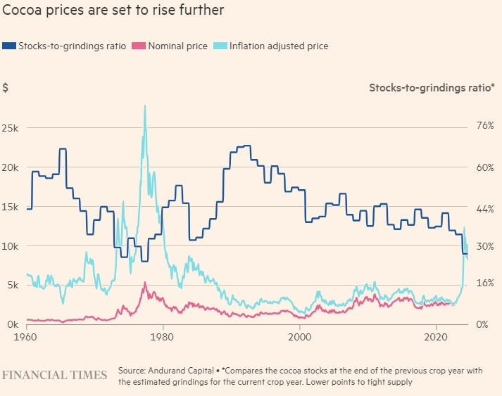 Аналогичное соотношение запасов и спроса привело к пику в 28 000 долларов за тонну с учётом инфляции в 1977 году после пятилетнего роста цен. Поскольку текущий рост цен длится всего год, а предложение, вероятно, будет снижаться в течение как минимум четырёх лет, есть все основания ожидать, что цены на какао достигнут новых максимумов с учётом инфляции.