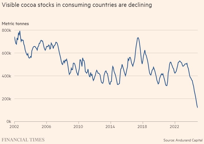 После резкого роста в первые четыре месяца года цены на какао-бобы несколько стабилизировались. В начале года стоимость тонны какао-бобов составляла около 4400 долларов, но к апрелю фьючерсные цены достигли пика в 12000 долларов, что значительно выше среднего показателя за десятилетие, скорректированного с учётом инфляции, который составляет 3400 долларов. Однако к маю цены упали до 7000 долларов за тонну. Однако, скорее всего, это временное затишье.