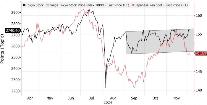 Индекс Topix держится в узком торговом диапазоне после большого летнего обвала. Однако иена прошла путь от 14-месячного максимума, достигнутого на уровне в 139,58 в середине сентября до минимума 156,75 в ноябре. Topix и иена в основном двигались независимо друг от друга в течение последних двух месяцев, при этом коэффициент детерминации — показатель связи между двумя отдельными наборами данных — почти равен нулю. Это значительно ниже отметки 0,50, которая указывает на наличие корреляции.