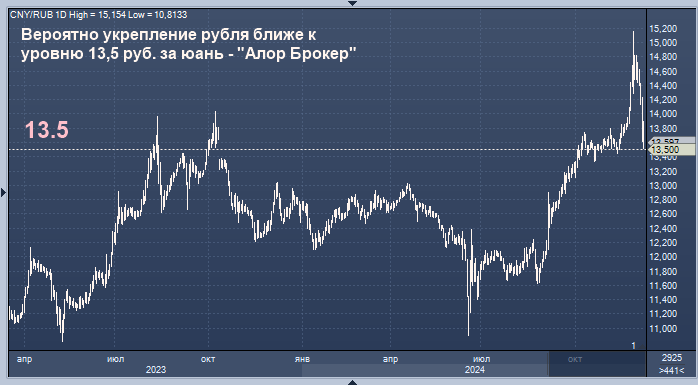 Вероятно продолжение укрепления рубля и уход курса валютной пары юань/рубль ближе к уровню 13,5 руб. за юань, считают аналитики инвестиционной компании "Алор Брокер".