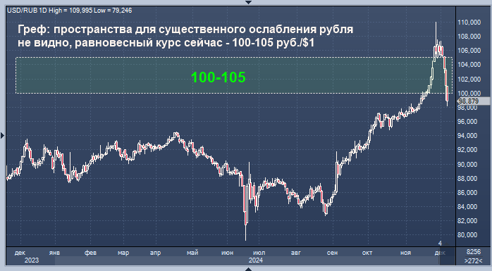 «Сегодня мы не ожидаем никаких сюрпризов с этим, он будет колебаться в зависимости от ситуации, сейчас мы не видим пока пространства для такого существенного ослабления рубля. Мы посчитали равновесный курс, который должен быть сегодня с учетом инфляции. Я раньше говорил — на уровне 90–95 рублей за доллар, сегодня это примерно 100–105 рублей — тот коридор, который должен быть сегодня», — сообщил Греф на «Дне инвестора» в пятницу.