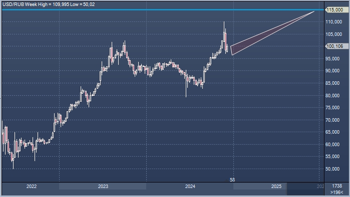 SberCIB Investment Research в рамках базового сценария ожидает ослабления курса рубля к концу 2025 года до 115 руб./$1 на фоне сокращения экспорта и повышенной инфляции. Такой прогноз озвучили аналитики инвестбанка в ходе вебинара, посвященного перспективам 2025 года.