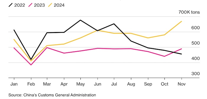 Ноябрьский экспорт алюминия достиг максимума с 2022 года. Источник: Главное таможенное управление Китая, Bloomberg