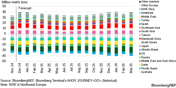 Мировой экспорт (ниже нуля) и импорт (выше нуля) СПГ по странам и регионам в млн метрических тонн (прогноз BloombergNEF). Источник: Bloomberg