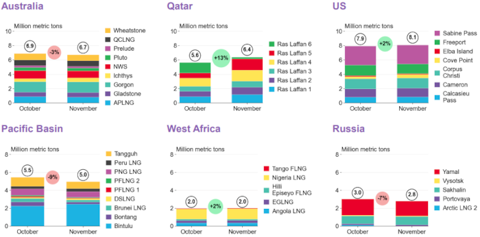BloombergNEF не дает отдельного прогноза на декабрь относительно динамики экспорта СПГ из России, но отмечает, что в ноябре данный показатель снизился на 7% м/м до 2,8 млн метрических тонн.