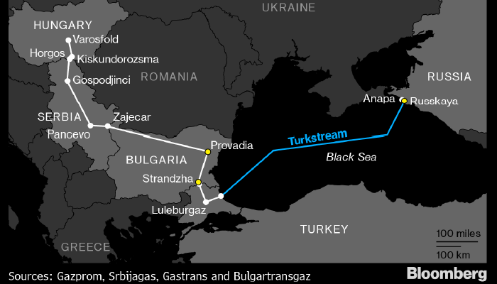 Маршрут поставок российского газа в Сербию и Венгрию по «Турецкому потоку» (желтым обозначены компрессионные станции). Источник: Bloomberg